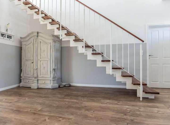 Schon im Eingangsbereich ist das Ankommen sehr offen und warm. Viel Licht dringt hier schon durch den gleich anliegenden Treppenraum mit einer wunderschönen Treppen ein.
