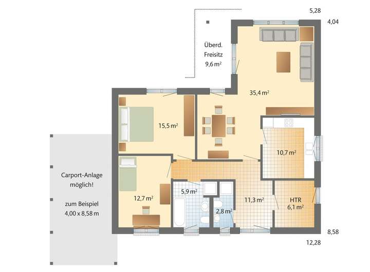 Anbauteile, Carport, Garage und Keller können Extras sein, die als Sonderausstattung angeboten werden. Abbildungen, Grundrisse und Flächenangaben sind beispielhaft und können Extras zeigen. Flächenangaben nach DIN 277.
