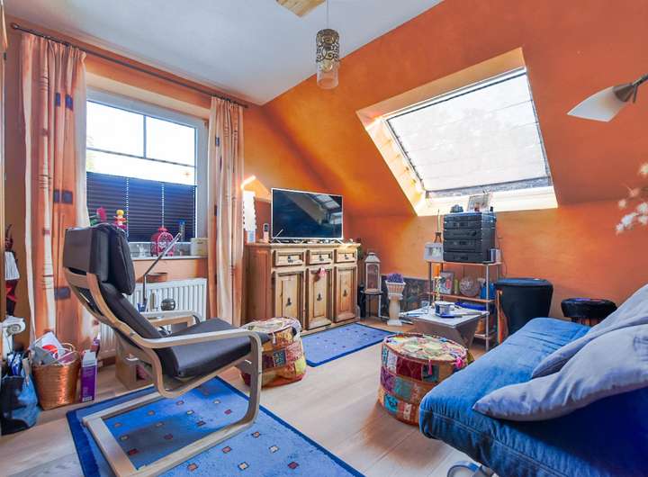 Ein Kaminofenanschluss ist im Wohnzimmer vorhanden.