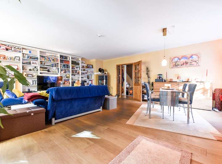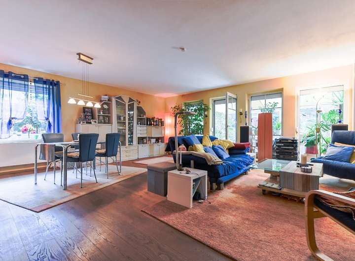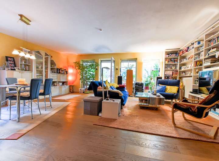 - ca. 38,59 m² großes Wohn- und Esszimmer mit Kaminofen