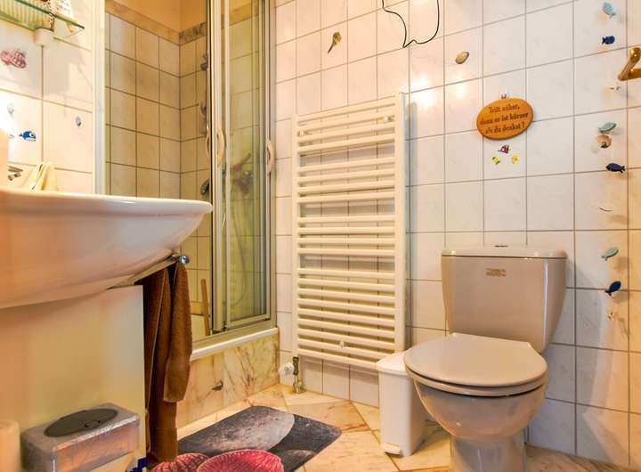 Sowohl das Hauptbad mit Wanne im DG als das Gäste-WC mit Dusche im EG verfügen über ein Fenster.