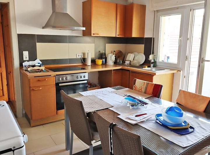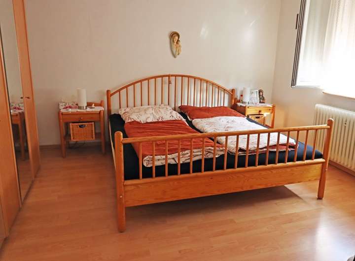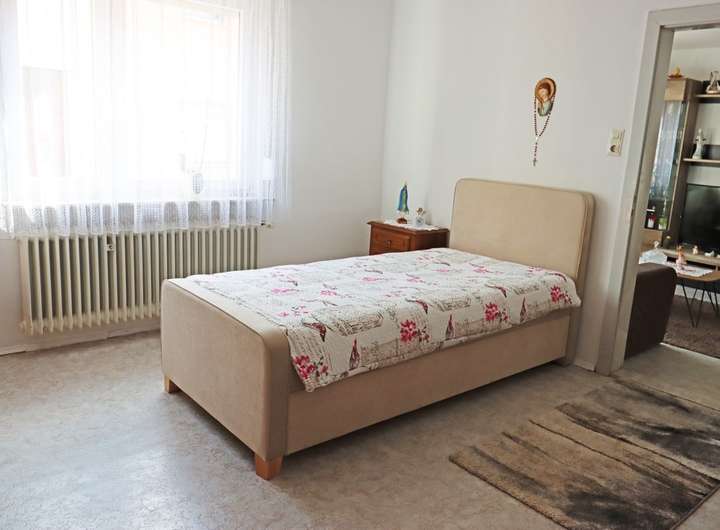 Das Haus teilt sich im Erdgeschoss auf in Wohn- und Schlafzimmer, Küche mit angrenzendem Abstellraum und Bad. Zum Eingangsbereich gelangen Sie durch die Hofeinfahrt.