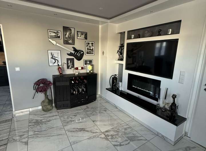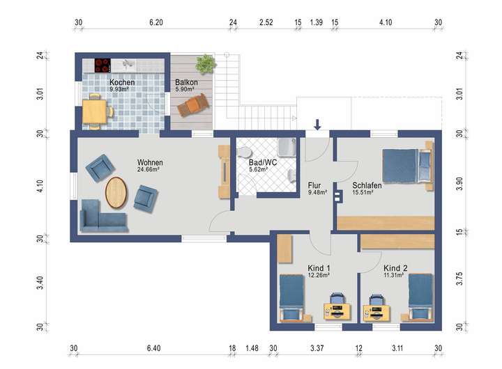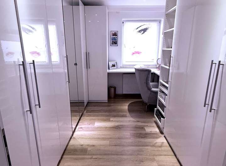 Im Erdgeschoss befinden sich geräumige, große Zimmer mit insgesamt 90 Quadratmetern Wohnfläche. Es umfasst ein großzügiges Wohn- und Esszimmer, ein zusätzliches Gäste-WC, ein Ankleidezimmer sowie ein Kinderzimmer. Das Erdgeschoss bietet somit ausreichend Platz für Familien und schafft durch die offene Gestaltung eine angenehme Atmosphäre.