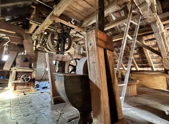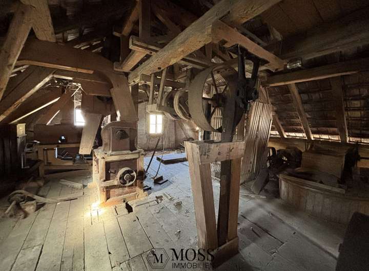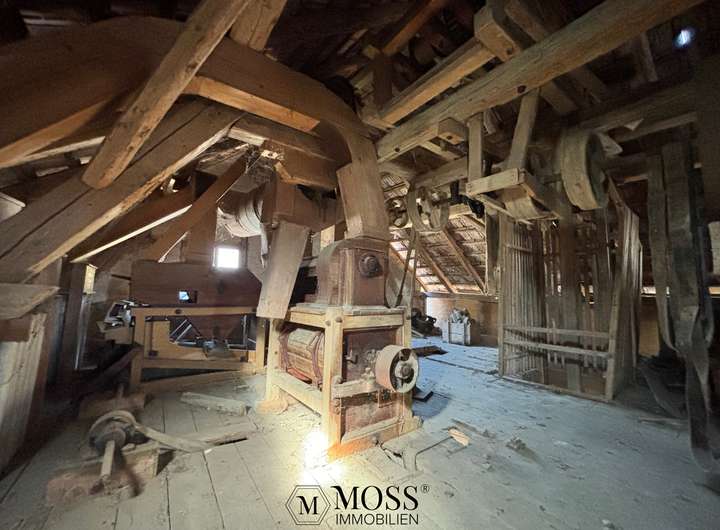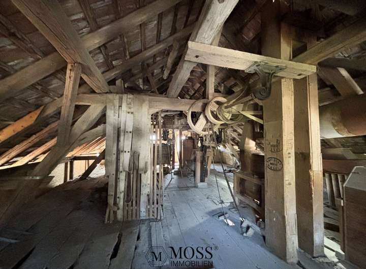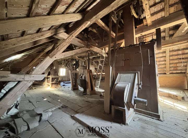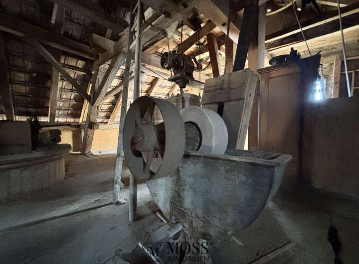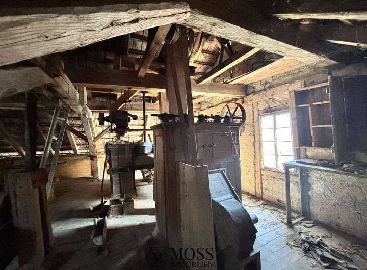 Für Liebhaber von historischen Gebäuden ist die Mühle das eigentliche Herzstück und genau bei der Mühle, so alt und verschlafen, wie sie da steht, blüht das Herz richtig auf. Sie ist komplett trocken, definitiv schützens- und erhaltenswert. Die Mühle biete eine interessante Fläche von ca. 70m2 pro Etage und sie hat 3 Etagen (Keller, Erdgeschoss und Dachgeschoss), also total ca. 220m2 Wohn-/ Nutzfläche. Die aktuellen Raumhöhen betragen im UG 2.0-3.30m, im EG 2.44m und im OG 2.0-4.0m. Somit ist auch hier ein interessantes Projekt möglich. Natürlich ist es auch möglich, die Mühle als Museum zu erhalten, denn es wurde nichts ausgebaut und sie befindet sich sozusagen im Originalzustand als der Mühlen-Betrieb vor rund 75 Jahren angehalten wurde.