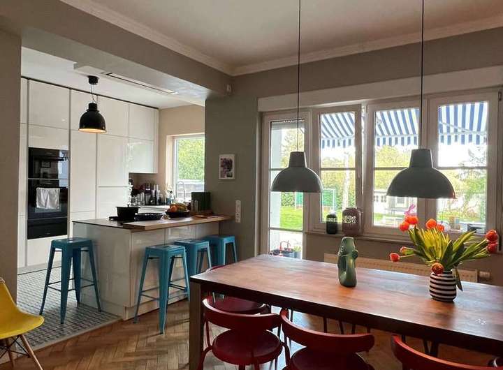 Auch die im Erdgeschoss eingesetzten Industrietüren zwischen Flur und Wohnzimmer sowie auch vom Flur zur Küche geben diesem Haus einen besonderen Flair. Auch die dezent blau/grau gemusterten Bodenfliesen in der Küche in Kombination mit der weißen Hochglanz-Einbauküche, dem Fischgrät-Parkett im Essbereich und Wohnzimmer zeigen Behaglichkeit und Liebe zum Detail.