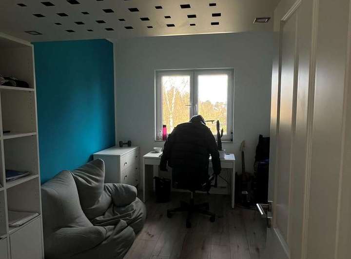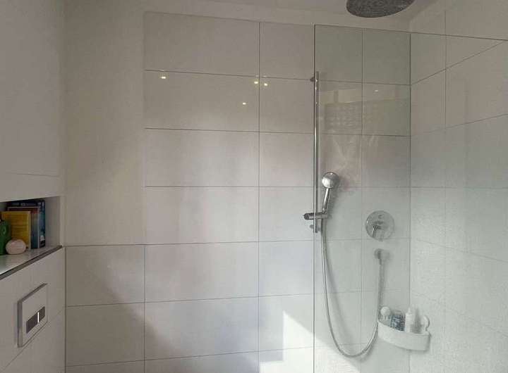 Die Kinderzimmer im Dachgeschoss sind mit Vinylböden in grauer Holzoptik ausgelegt, was zu den modernen weißen Einbauschränken in den Jugendzimmern hervorragend passt. Das Duschbad im Dachgeschoss ist weiß gefliest mit blau/grau gemusterten Bodenfliesen.