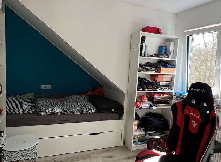 Im 1. Obergeschoss befindet sich ein Kinderzimmer, das sehr schön und raffiniert mit einem Hochbett gestaltet ist. Nebenan ist das Elternschlafzimmer mit Zugang auf den ca. 4m² großen Balkon, von dem man direkten Gartenblick hat. Nebenan befindet sich ein Arbeits-/Gästezimmer und ein Badezimmer mit Dusche und Badewanne.