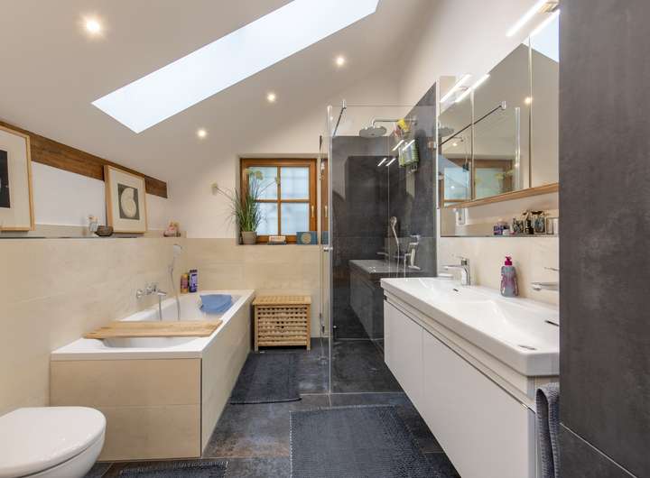 Die Immobilie verfügt über zwei vollwertige Bäder, die modern gestaltet sind und sowohl Funktionalität als auch Komfort bieten. Zudem gibt es ein separates Büro, das sich perfekt für Homeoffice oder kreative Projekte eignet.