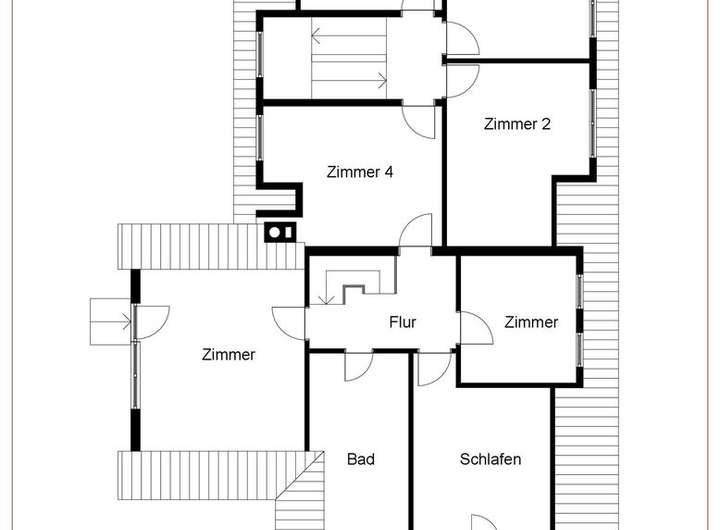Dachgeschoss: Badezimmer mit Dusche und Wanne, Schlafzimmer, zwei Kinderzimmer, vier weitere Zimmer zur individuellen Nutzung, Zugang zum Dachboden (Stauraum)