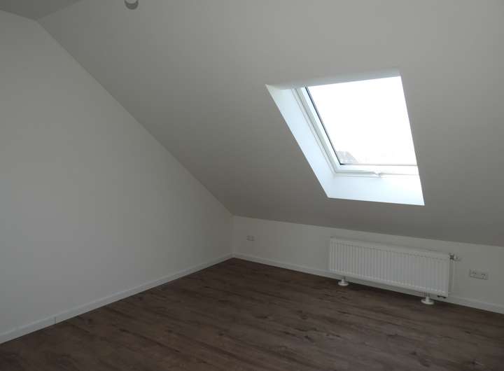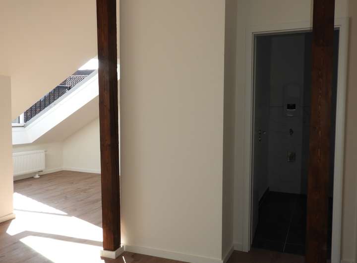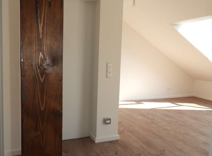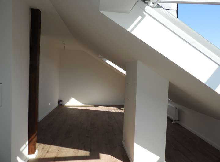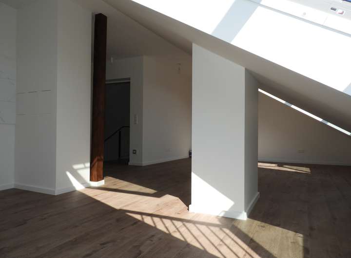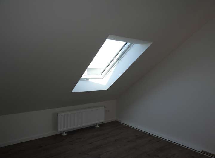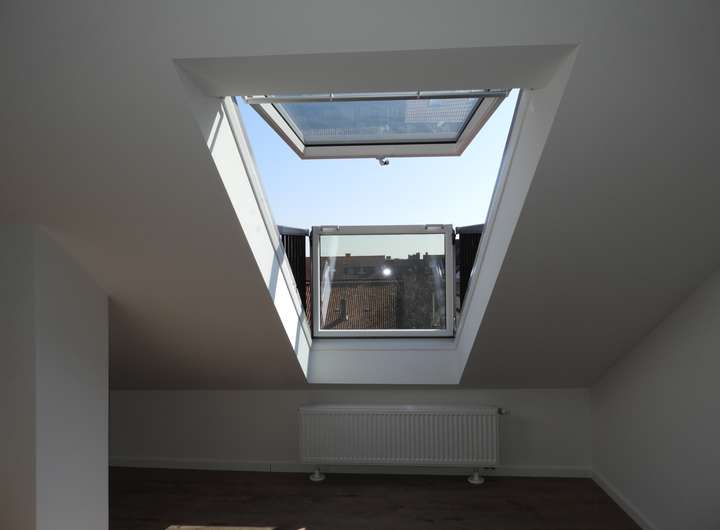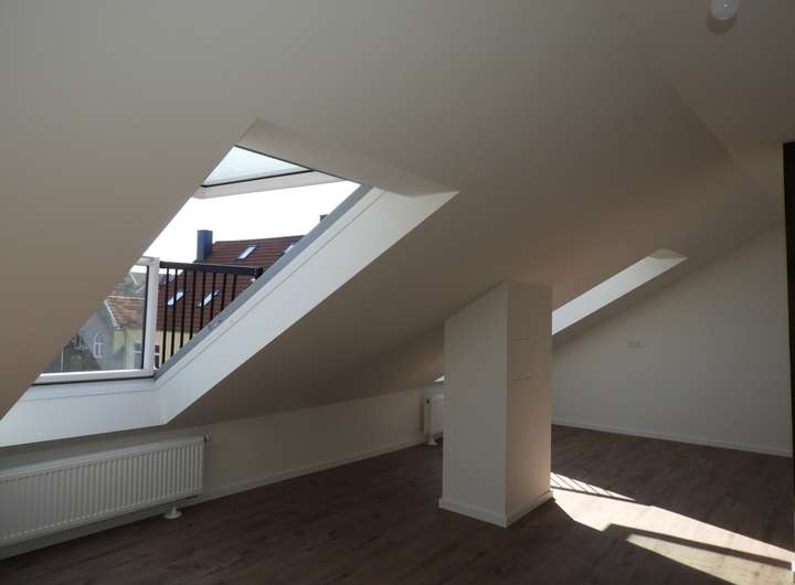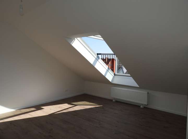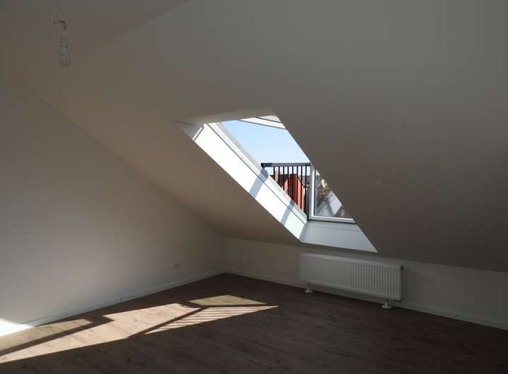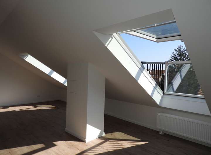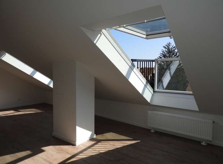 Die großen Velux Fenster mit einer großen Öffnung geben der Wohnung einen Balkon Flair.