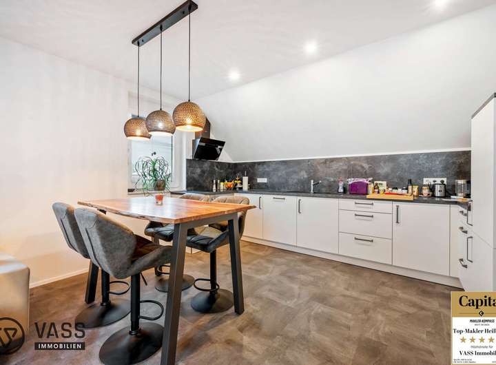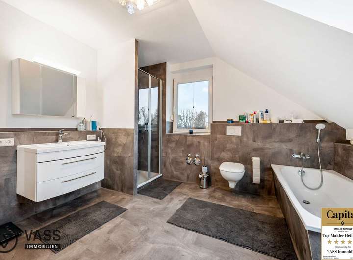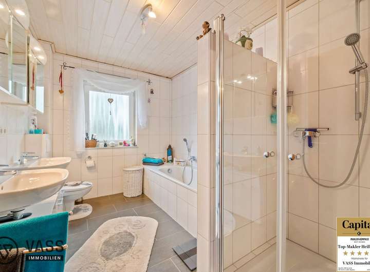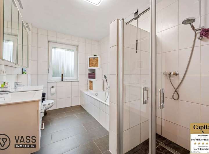 In der Erdgeschosswohnung sowie in der Obergeschosswohnung befindet sich jeweils ein großzügiger Hauswirtschaftsraum, der direkt an die Küche angrenzt. Hier besteht die Möglichkeit, die Waschmaschinen bequem innerhalb der Wohneinheiten anzuschließen. Die Dachgeschosswohnung wurde 2022 nach KfW 55 -Standard ausgebaut und muss daher insgesamt 10 Jahre vermietet bleiben. Jede Wohneinheit verfügt über eine großzügige Badewanne und eine zusätzliche Dusche.