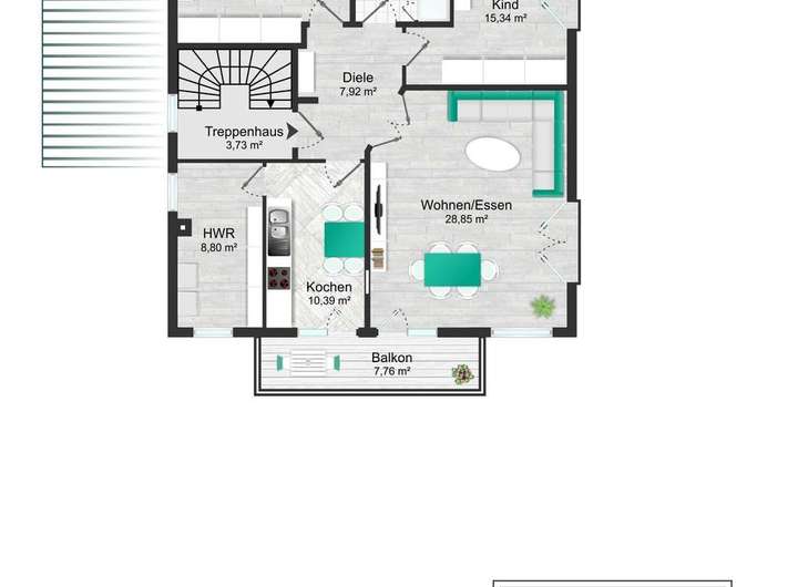• 1. OG (ca. 105 m²): 3 Zimmer + Abstellraum, modernes Badezimmer