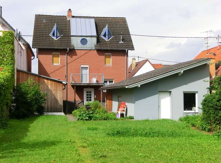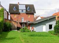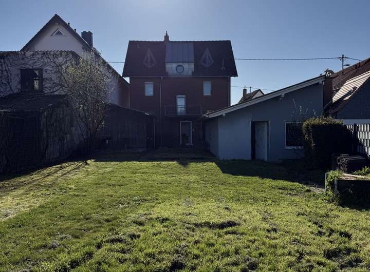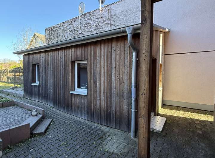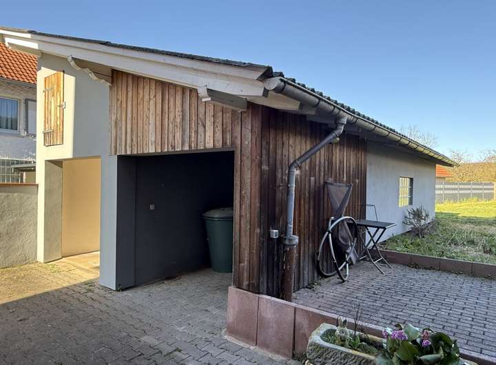 Hinter dem Wohnhaus befindet sich links eine offene Doppelrage mit diversen Räumen dahinter sowie Lagerfläche über den Garagen. Rechts davon gibt es eine "Sommer-/Waschküche", die mit ca. 17,11 m² weiteres Ausbaupotential zur Wohn-/Nutzflächenerweiterung bietet.