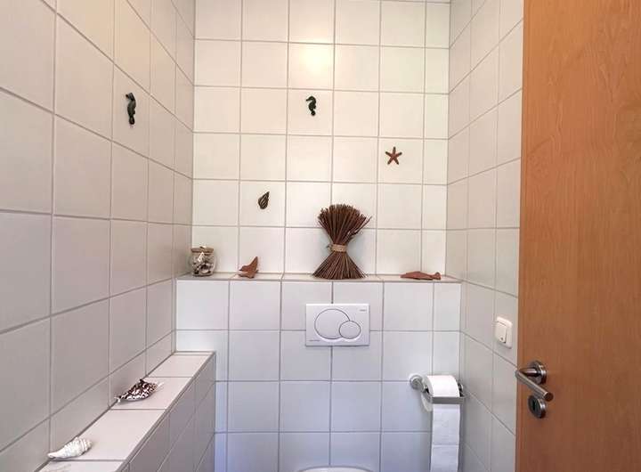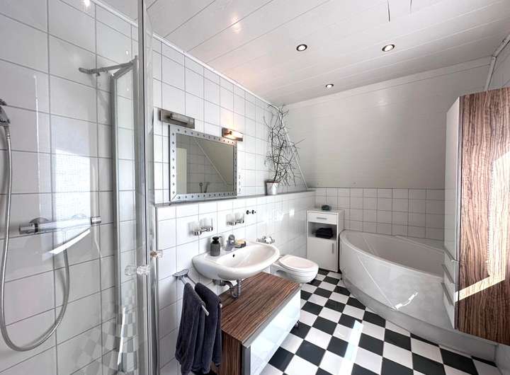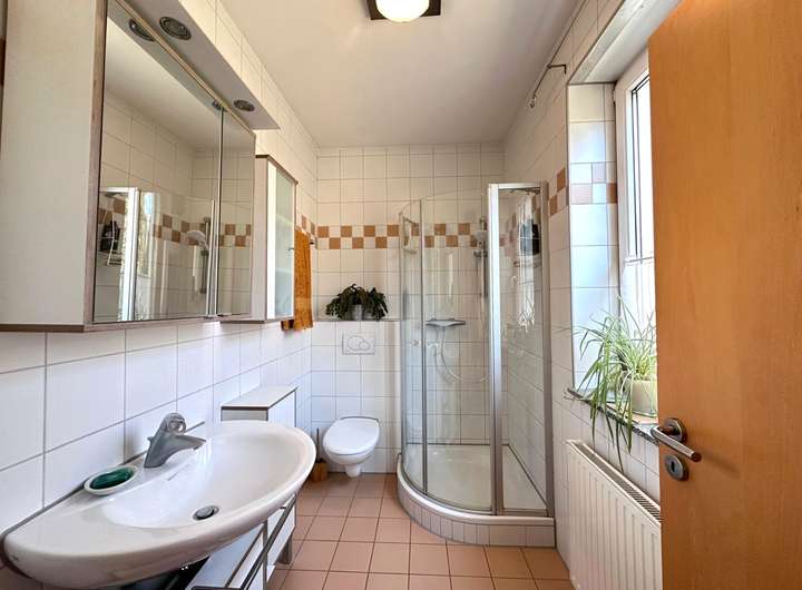 •Tageslichtbad mit Dusche, Badewanne, Waschbecken und Toilette (gefliest)
