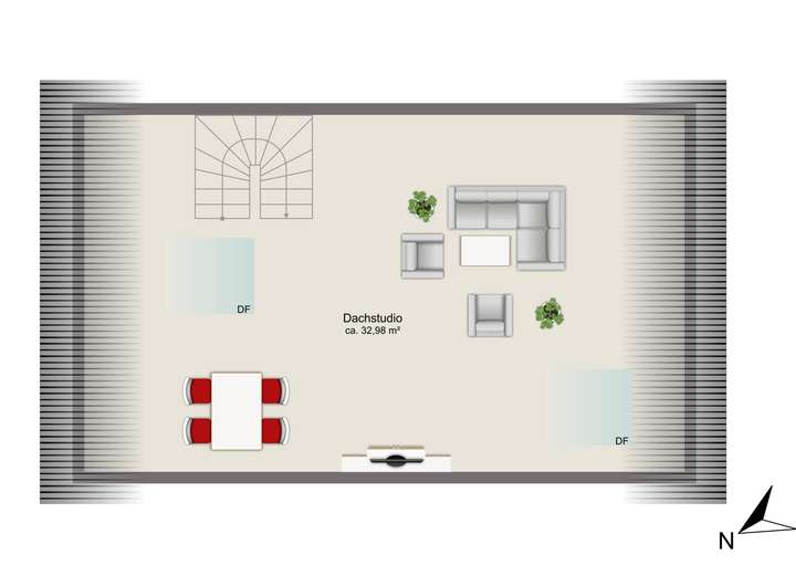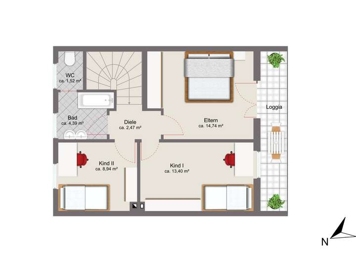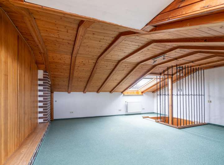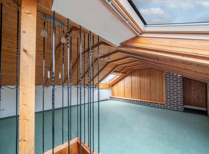 Das Obergeschoss bietet drei geräumige Schlafzimmer, eines davon mit Zugang zum sonnigen Balkon. Das Badezimmer ist mit einer großen Dusche, Doppelwaschbecken und separatem WC ausgestattet. Eine massive Holztreppe führt ins ausgebaute Dachstudio, das vielseitig nutzbar ist – als Büro, Jugendzimmer oder zusätzlicher Wohnraum. Dachflächenfenster sorgen hier für angenehmes Tageslicht.