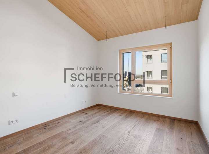 Jede Wohnung empfängt Sie mit einem Bodenbelag Ihrer Wahl, beispielsweise edlem Echtholzparkett, einer eleganten Decke aus Weißtanne und hochwertigen Holz-Alu-Fenstern, die nicht nur für eine langlebige Optik sorgen, sondern auch das Raumklima positiv beeinflussen.