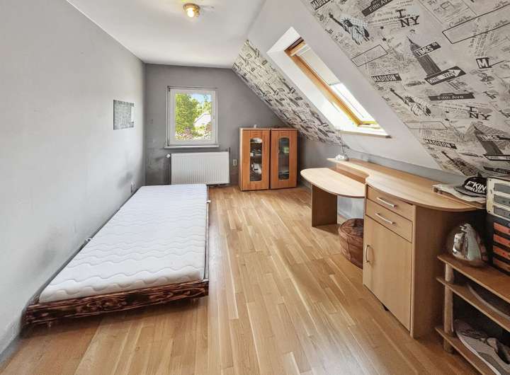 Im Dachgeschoss erwartet Sie ein weiteres Schlafzimmer mit Bad en Suite, welches mit einer moderner Eckbadewanne und Dusche ausgestattet ist. Zwei weitere Räume nutzen Sie ganz nach Bedarf als Kinder- oder Arbeitszimmer.