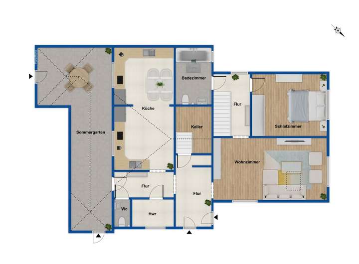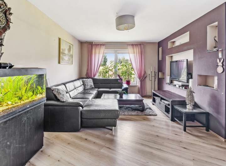 Im Erdgeschoss bietet ein lichtdurchflutetes Wohnzimmer viel Platz für eine gemütliche Wohnlandschaft. An kalten Tagen spendet ein Kaminofen wohlige Wärme. Die Küche überzeugt mit einem großzügigen Platzangebot und grenzt direkt an den lichtverwöhnten Sommergarten mit Austritt auf die sonnenverwöhnte Terrasse. Zudem erfreuen Sie sich an einem modernen Badezimmer mit Badewanne, ein zusätzliches Duschbad ist im praktischen Hauswirtschaftsraum untergebracht. Im behaglichen Schlafzimmer findet auch ein üppiger Kleiderschrank seinen Platz. Abgerundet wird diese Wohnebene durch eine Gästetoilette.