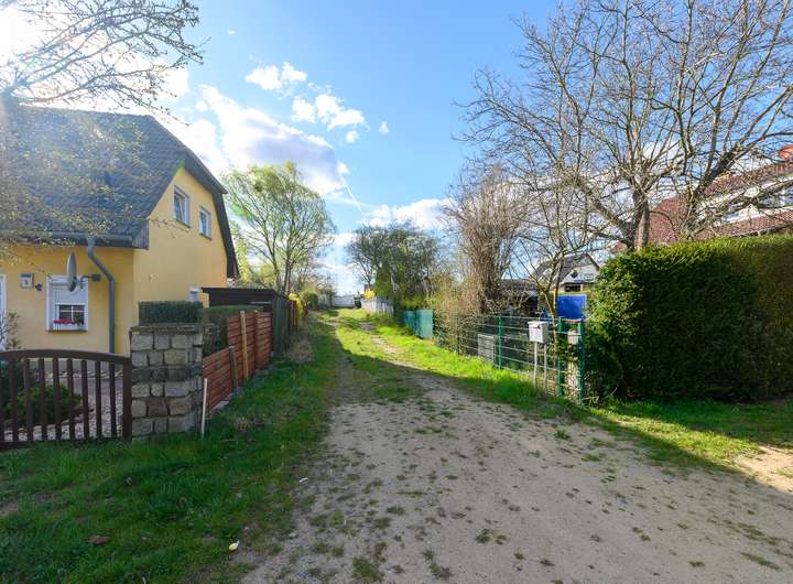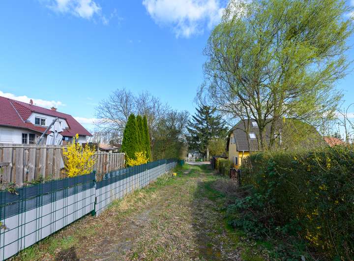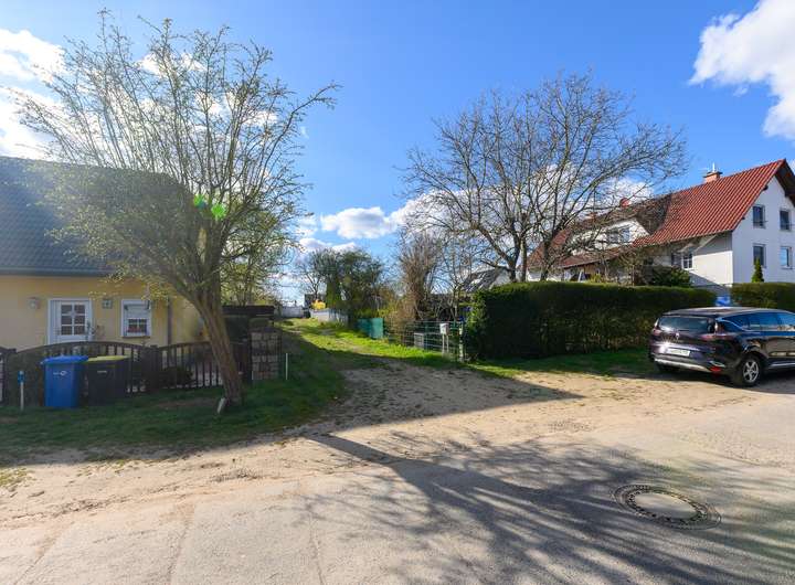 Das Baufeld des Grundstücks in zweiter Reihe ist ca. 733 m² groß und hat die Abmaße von ca. 40 m * 18 m. Es ist rechtwinklig geschnitten und verläuft etwa in West-Ost-Richtung. Zum Grundstück führt eine ca. 41 m lange und 2,40 m breite Zufahrt. Nach Rücksprache mit der Baubehörde des Landkreises besteht weiterhin dauerhaft Baurecht gemäßt §34 BauGB, auch die Zufahrt gilt als öffentliche Zuwegung.