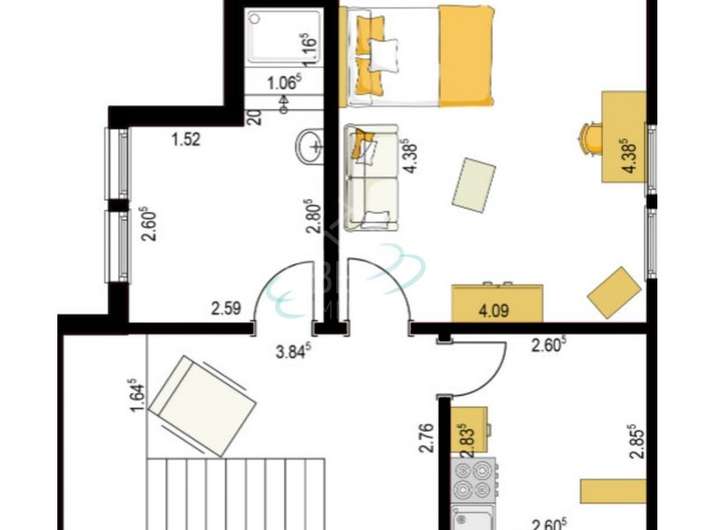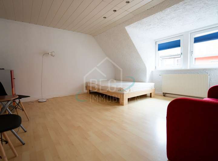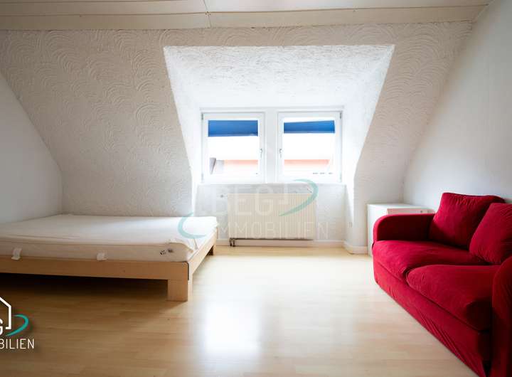 Geradeaus gelangen Sie in den großzügigen Wohn- und Schlafbereich, der mit seiner gemütlichen Atmosphäre zum Entspannen einlädt. Links vom Flur finden Sie das Badezimmer.