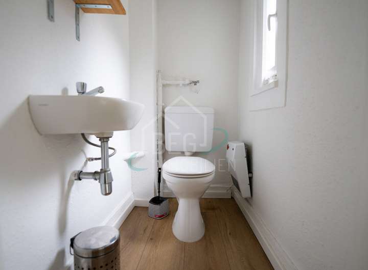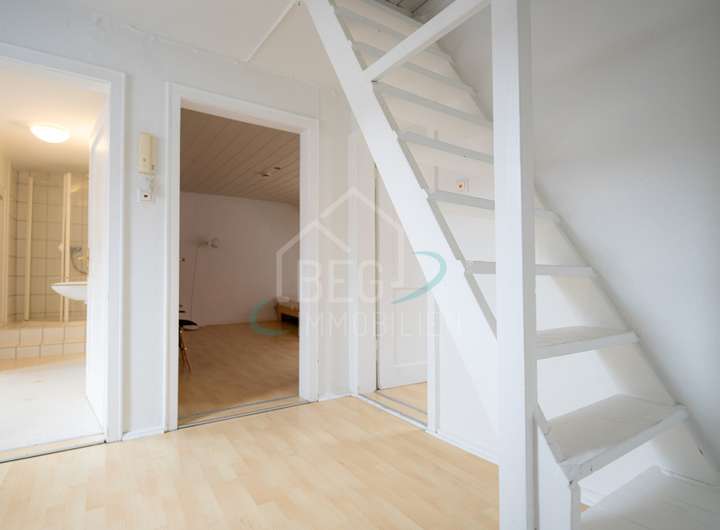 Beim Betreten der Wohnung gelangen Sie zunächst in den Eingangsbereich, in dem sich direkt das WC befindet. Über eine Treppe erreichen Sie den oberen Wohnbereich.