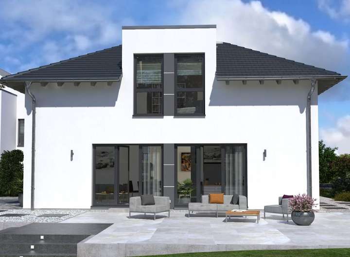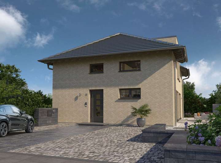 Der Lieblingsort der Stadtvilla 12 ist schnell gefunden: im Obergeschoss, direkt im Bereich des Erkers, der durch zwei große Fenster besticht. Hier finden die beiden Kinder ihren Rückzugs-, Lern- und Spielbereich, da der Erker sich über beide Zimmer erstreckt. Zudem fungiert er als zentrales Gestaltungselement, das das Walmdach auf architektonisch ansprechende Weise durchbricht. Apropos Walmdach: Diese Dachkonstruktion sorgt dafür, dass das obere Stockwerk nicht als Vollgeschoss zählt (Hamburger Eingeschossigkeit), wodurch die Stadtvilla auch dort gebaut werden kann, wo nur eingeschossige Bauweisen erlaubt sind - ohne dabei auf Komfort und Raum verzichten zu müssen. Der Mittelpunkt des Hauses ist der großzügige Wohn-Ess-Kochbereich mit über 42 m², der direkten Zugang zum Garten bietet. Das Raumangebot im Erdgeschoss wird durch einen großen Hauswirtschaftsraum, ein Gäste-WC und einen Abstellraum ergänzt. Im Obergeschoss haben nicht nur die Kinder ihren Lieblingsort, auch die Eltern finden ausreichend Platz zum Schlafen und Träumen. Ein weiteres Highlight ist das fast 15 Quadratmeter große Badezimmer.