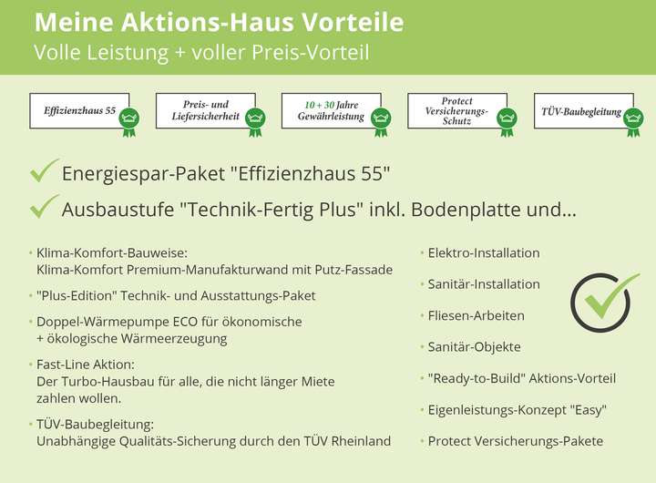 Diesem Angebot liegt die beliebte Danhaus-Ausbaustufe "technik-fertig" zugrunde. Diese kann selbstverständlich noch entsprechend Ihrer geplanten Eigenleistungen angepasst werden.