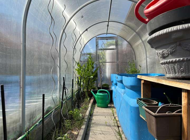 Der Garten überzeugt mit einer Terrasse, einem Gewächshaus, einem Carport und einer direkt angrenzenden Werkstatt, vorteilhaft für Leute im Handwerk.