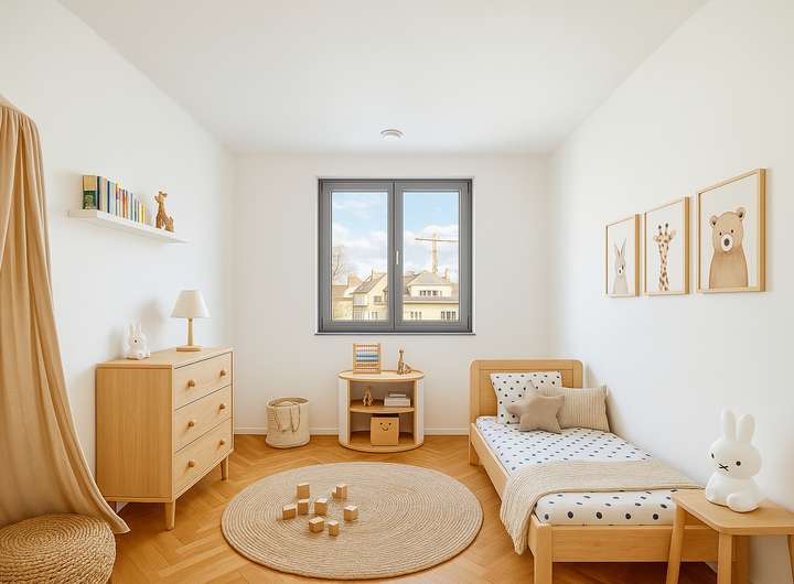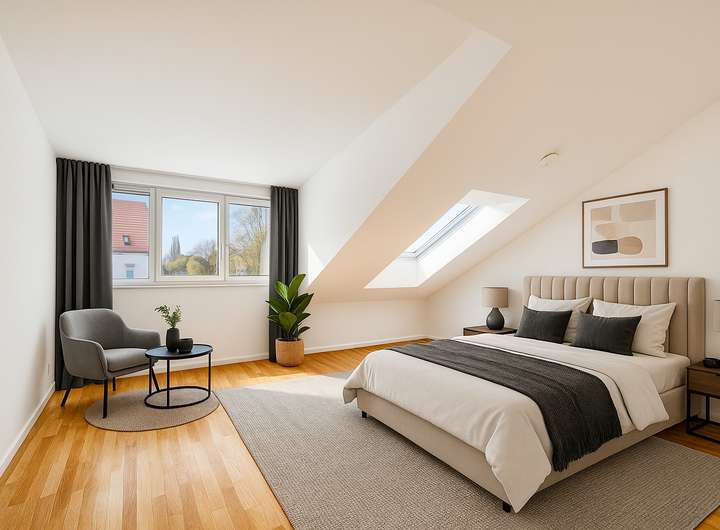 Die Maisonettewohnung 5.4 befindet sich im 1. Obergeschoss und Dachgeschoss auf der Nordseite im "Haus 5". Sie hat damit Fenster zu drei Himmelsrichtungen - eine Besonderheit, die die Wohnung hell & lichtdurchflutet macht. Der separate Zugang zur Wohnung erfolgt von Osten über eine Art Laubengang. Auf der unteren Etage befindet sich der mit fast circa 44 Quadratmeter sehr großzügige offene Küchen-, Ess- und Wohnbereich. Zwei der fünf Schlafzimmer (nach Osten ausgerichtet) sowie das Wannenbad und der Hauswirtschaftsraum befinden sie ebenfalls im 1. Obergeschoss. Vor dem Essbereich liegt der etwa 10 Quadratmeter große Westbalkon mit Sonne satt und tollem Blick in den Gemeinschaftsgarten. Die Treppe hoch unter dem Satteldach sind die drei anderen Schlafzimmer und das Duschbad. Das westliche Schlafzimmer (etwa 27,5 Quadratmeter) hat eine große Gaube und ein Dachflächenfenster, das östliche circa 14 Quadratmeter-Zimmer zwei Dachflächenfenster. Die Kinder könnten hier oben ihr eigenes kleines Reich haben! Das Kellerabteil zur Wohnung befindet sich ebenfalls in "Haus 5".