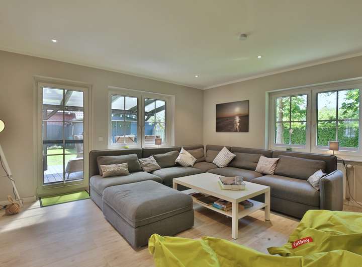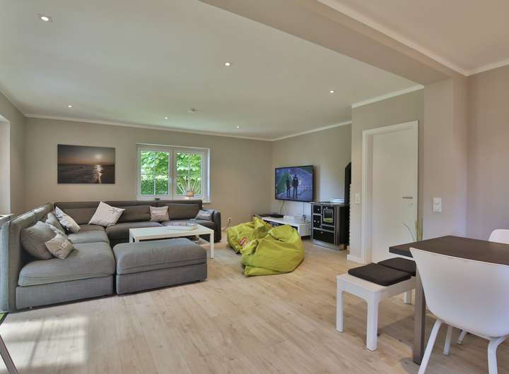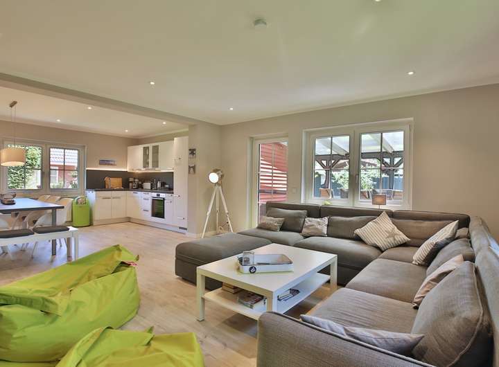 Eine große und gemütliche Eck-Couch im Wohnbereich lädt zu gemeinsamen Abenden ein. In zusätzlichen großen Fatboy-Sitzsäcken lümmeln sich Jung und Alt.