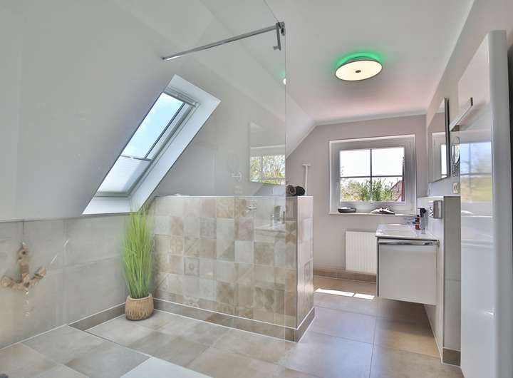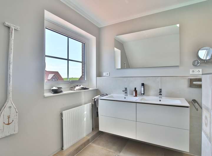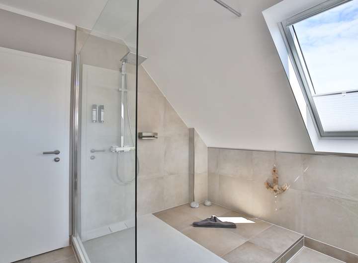 • 1 großes Masterbad mit Blick auf den Nordseedeich, einem großem offenen Duschbereich und einem WC