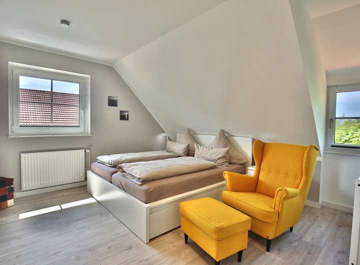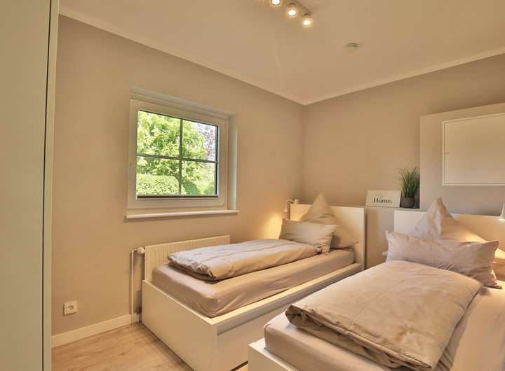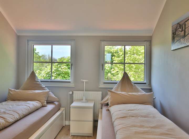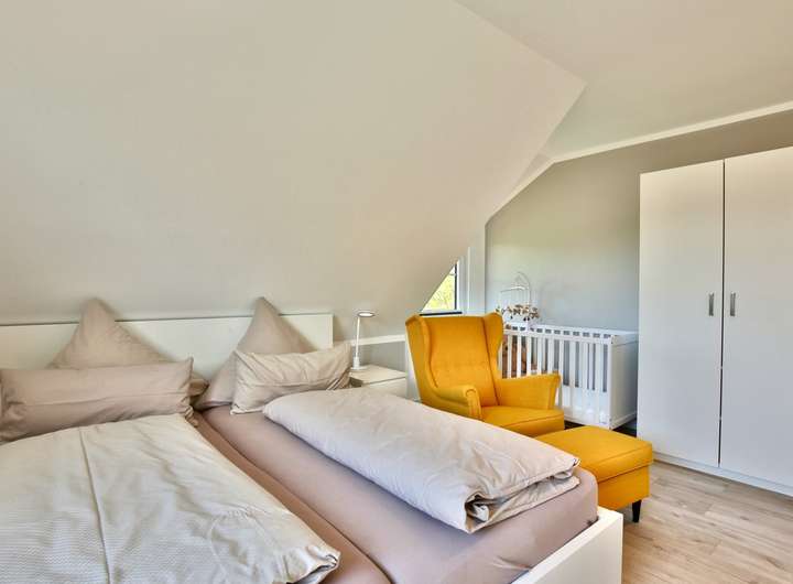Das Master-Schlafzimmer ist mit einem Doppelbett (180 x 200 cm) ausgestattet, einem Babybett und einem 55 Zoll-TV. Alle anderen Schlafzimmer verfügen jeweils über zwei Einzelbetten (90 x 200 cm), welche selbstverständlich auch zusammengeschoben werden können. Für ausreichend Stauraum ist in jedem Zimmer gesorgt.