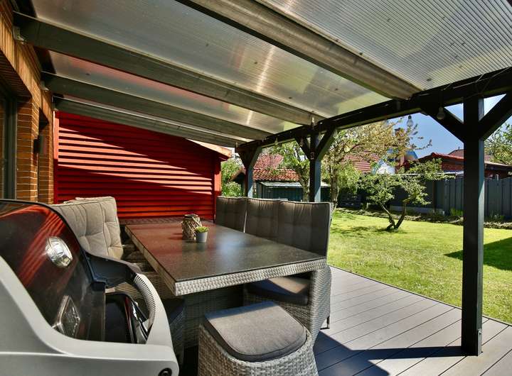 Teilüberdachte ca. 35 qm große Terrasse, mit hochwertigen WPC-Dielen verlegt: