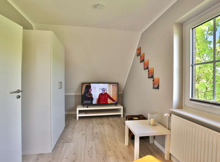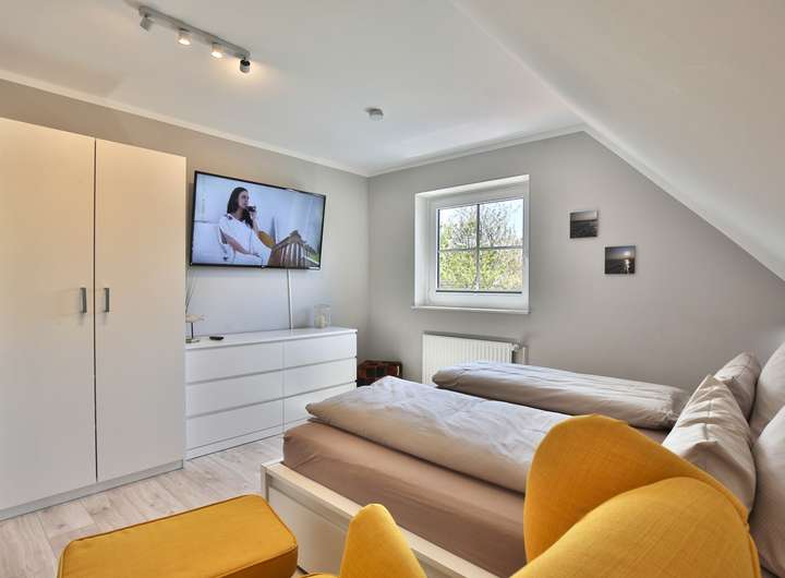• 1 großes Master-Schlafzimmer mit 2 Kleiderschränken, TV-Gerät und einem Kinderbett mit Blick auf den Nordseedeich