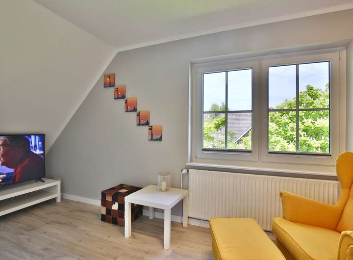 Das Haus liegt ruhig und dennoch nur wenige Gehminuten vom Inseltrubel entfernt. In etwa 10 Minuten erreicht man das Zentrum und in nur ca. 15 Minuten den Strand. Auch der Bahnhof und der Inselflughafen sind in nur 5-10 Minuten erreichbar. Kinder können sich auf einem nahegelegenen Spiel- und Bolzplatz austoben. Direkt dahinter beginnt der Deich, den man sogar aus dem 1. Obergeschoss des Hauses sehen kann.