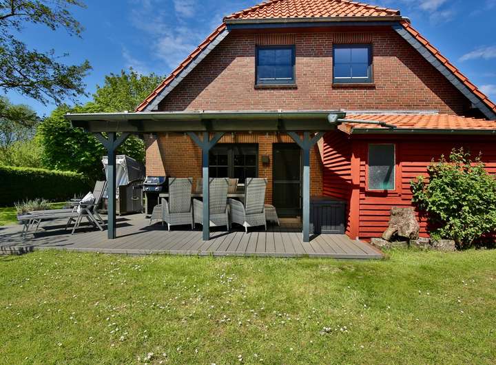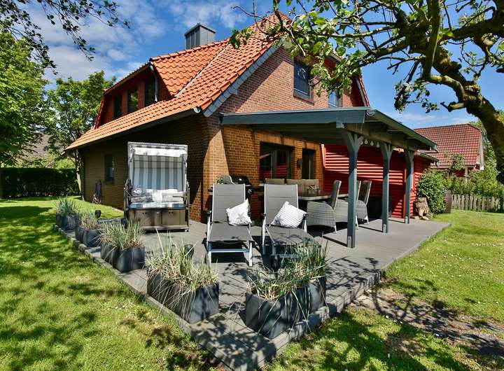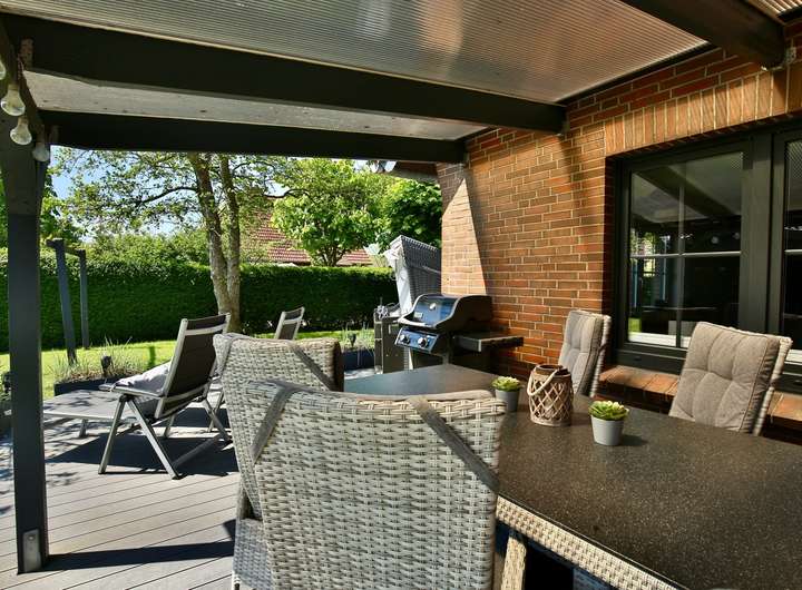 Vom Wohnbereich aus eröffnet sich auch der Zugang auf die südlich gelegene möblierte 35 m² große und überwiegend überdachte Terrasse mit eigenem Strandkorb und eigenen Strandliegen. Ein Weber-Gas-Grill lässt kaum mehr Wünsche übrig.
