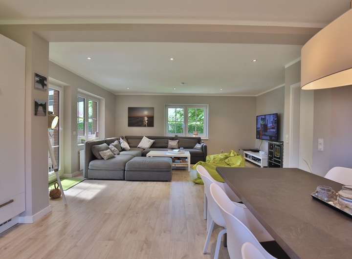 Im Erdgeschoss befindet sich der offen gestaltete Wohn- und Essbereich. Ein großer Esstisch für 8 Personen steht für Sie bereit, um mit der ganzen Familie oder allen Freunden in gemütlicher Atmosphäre zu speisen.