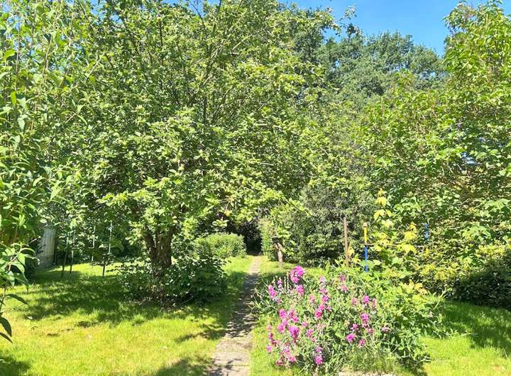 Das Areal ist teilweise eingezäunt und gesäumt von schönen Rhododendren, Büschen sowie ehrwürdigen alten Bäumen.