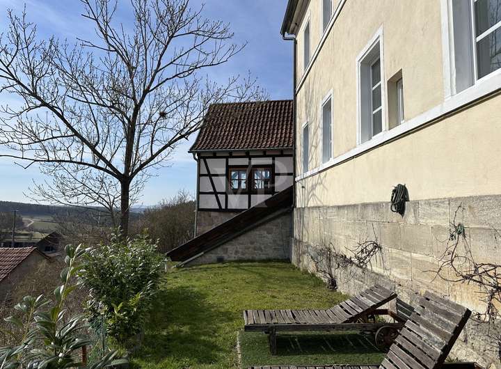 Besonders reizvoll für Künstler und Kreative ist das charmante „Atelierhaus“ aus Fachwerk mit verglasten Gefachen, das einen freien Blick über das Dorf und die Rhön eröffnet. Derzeit als Partyraum genutzt (mit abgehängter Decke), bietet es die perfekte Umgebung für Ausstellungen, Workshops oder ein eigenes Atelier. Direkt angrenzend lädt eine sonnige Terrasse dazu ein, unter freiem Himmel zu verweilen und neue Ideen zu entwickeln.