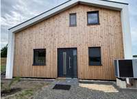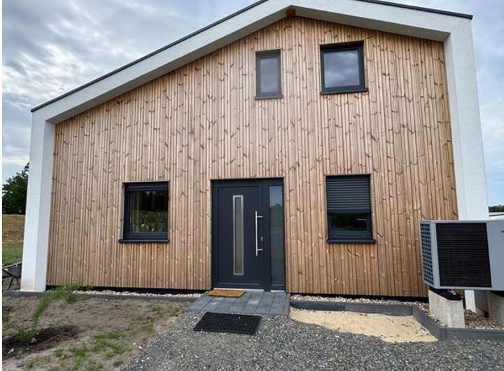 schlüsselfertig übergeben. Die Außenfassade kombiniert natürliche Holzverkleidung