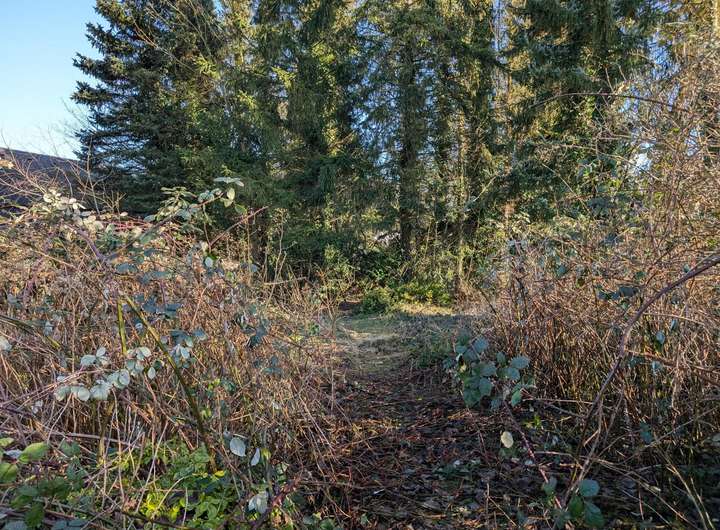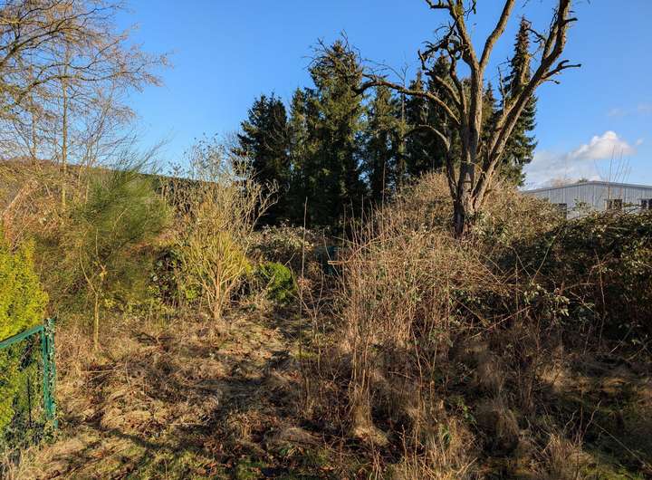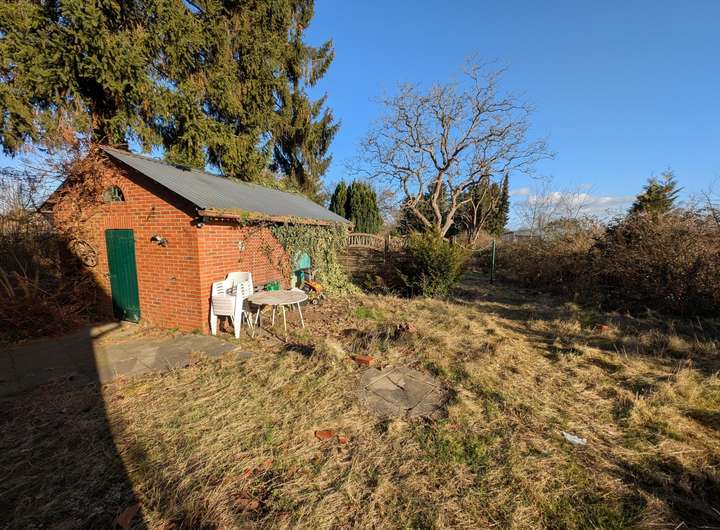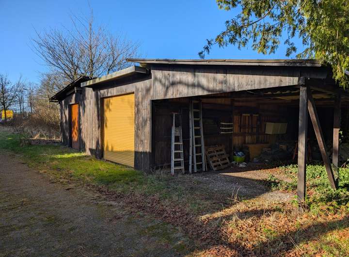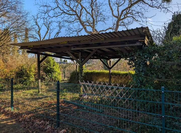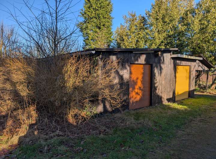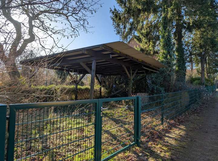 Auf dem ca. 2.763 m² großen Grundstück befinden sich mehrere Nebengebäude, darunter ein kleines Nebengebäude, ein baufälliges Doppelcarport sowie ein Schuppen mit angrenzendem Carport. Der Garten ist inzwischen stark verwildert und erfordert umfangreiche Rückschnitt- und Pflegearbeiten – bietet aber durch seine Größe viel Potenzial für Neuplanung oder Neuanlage.