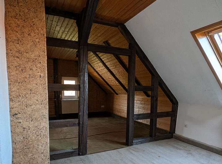 Ein großzügiger, offener Wohn- und Essbereich mit Kaminofen sorgt für eine besondere Atmosphäre und bietet vielfältige Gestaltungsmöglichkeiten. Das Haus ist teilunterkellert.
