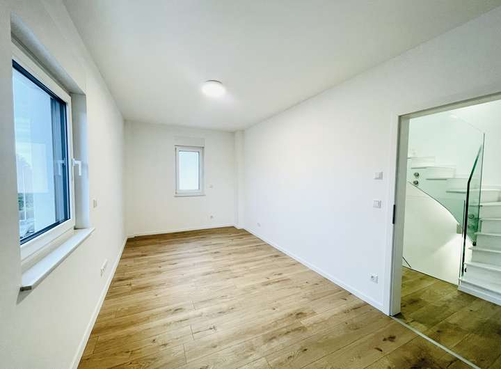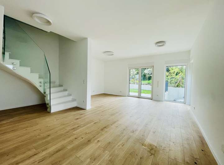 Im Erdgeschoss erwartet Sie ein großzügiger, offener Wohn- und Essbereich mit offener Küche, der durch seine großen Fensterfronten eine angenehme und lichtdurchflutete Atmosphäre schafft. Der Zugang zu einer kleinen Terrasse lädt zum Entspannen im Freien ein und macht das Wohnen besonders lebendig.
