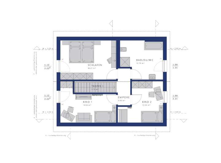 Highlight ist die Hausvariante mit Flachdach und Garagenanbau, die dem Haus noch einmal einen ganz eigenständigen Look in der EVOLUTION Hausfamilie gibt. Innovativ: Diese Bezeichnung steht auch für den Grundriss. Die geradläufige Treppe und der moderne Wohn-Essbereich mit Küche sind nur einige der besonderen Merkmale dieses Hauses. Denn auch im Obergeschoss hat das EVOLUTION 134 mit großen Räumen, zwei Kinderzimmern und Wellness-Bad richtig viel zu bieten.