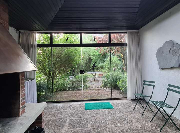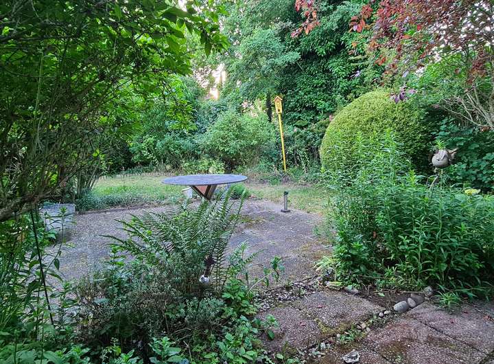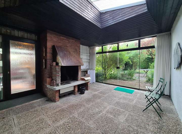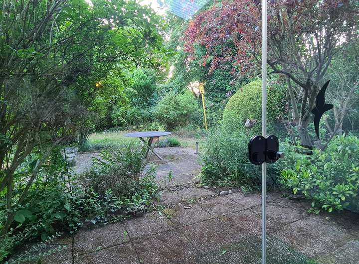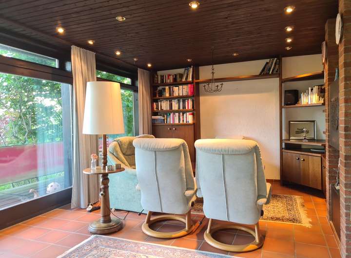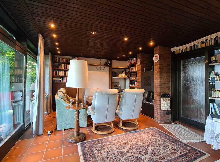 Von einem ca. 21 m² großen integrierten atriumähnlichen Wintergarten, der mit einem offenen Kamin ausgestattet ist und auch als Kaminzimmer genutzt wird, gelangt man an der Westseite des Hauses ebenerdig auf das naturnah angelegte Gartengrundstück, das komplett eingefriedet und als Rasenfläche mit Ziersträuchern angelegt ist.