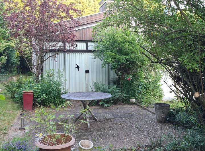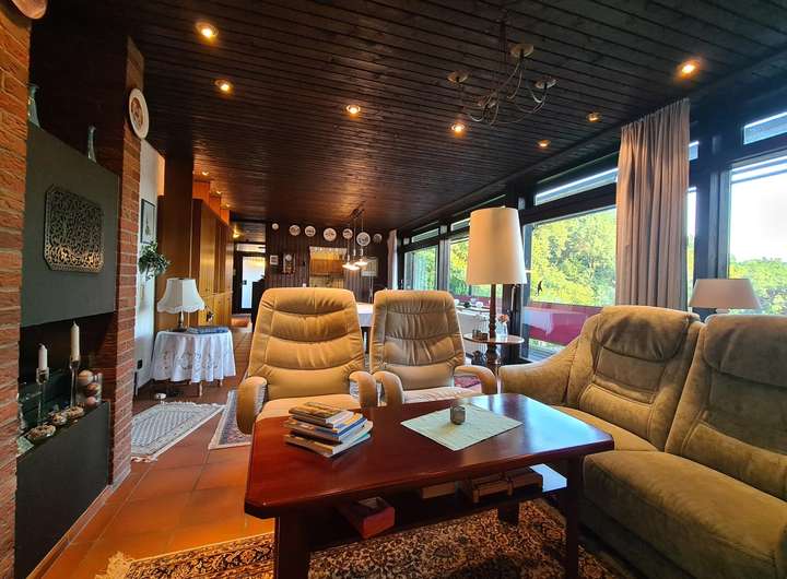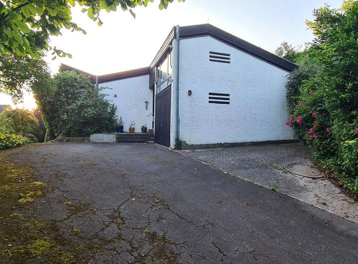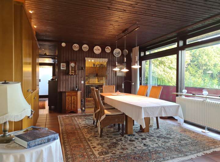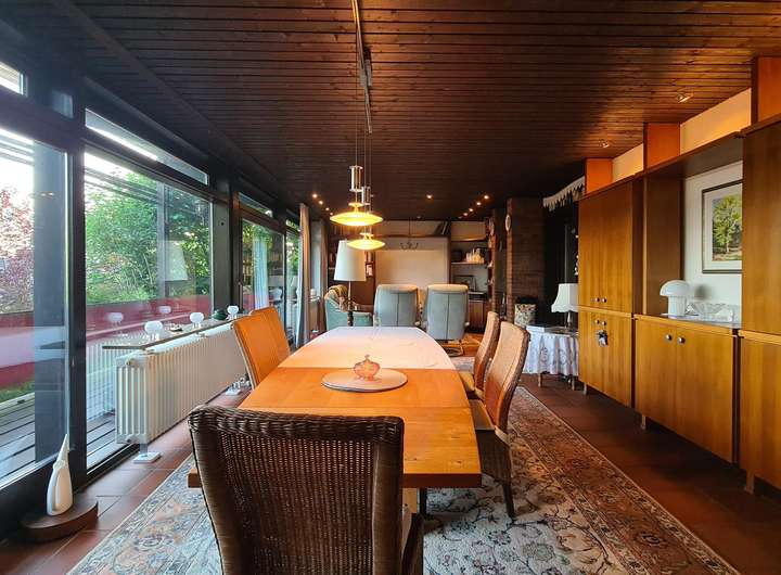 Das im Jahr 1972/1973 als Architektenhaus in Massivbauweise errichtete Anwesen ist ein eingeschossiger Bungalow mit Satteldach und großen bodentiefen Fensterelementen zur Südseite, die alle auf einen ca. 28 m² großen überdachten Südbalkon hinausführen.