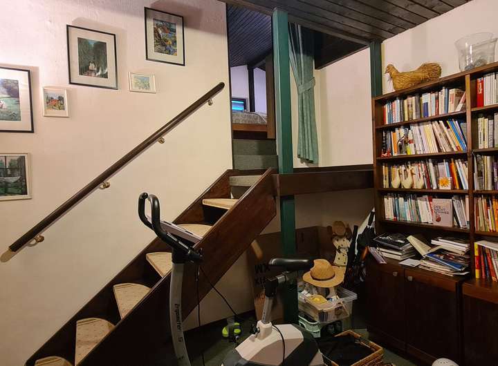 Die Fußböden sind im ca. 38,5 m² großen Wohn- und Essbereich Terrakottafliesen, Parkettboden im Elternschlafzimmer, im ca. 19 m² großen Kinder- oder Jugendzimmer mit Galerie Teppichboden bzw. Dielenboden auf dem höher gelegenen Galeriebereich.
