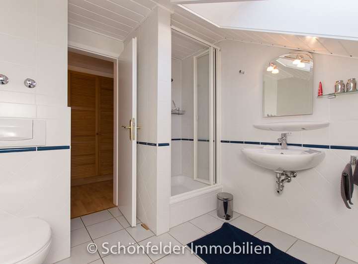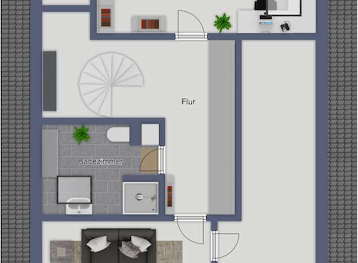 Über eine Wendeltreppe gelangen Sie vom Wohnbereich direkt in das ausgebaute Dachgeschoss mit rund 60 m². Es bietet zwei geräumige Zimmer, die vielseitig genutzt werden können, sowie ein zusätzliches Duschbad. Ideal für Jugendliche, Gäste oder als Home-Office-Bereich.