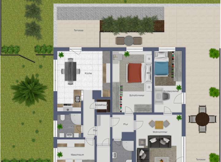 Der sonnige Garten ist ein weiteres Highlight – hier können Kinder sicher spielen und sich austoben, während die verkehrsberuhigte Straße nur von Anwohnern befahren wird.