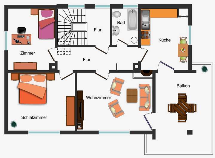 Die mittlere Wohnung hat eine ähnliche Aufteilung mit drei Zimmern, Küche und Bad.